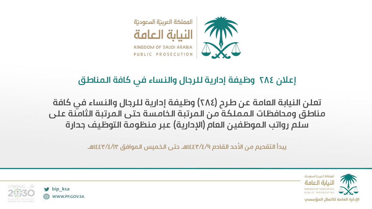 النيابة العامة تعلن 284 وظيفة للرجال والنساء. وظائف إدارية وفنية وهندسية وفنية 1443. النيابة العامة تعلن عن توفر 100 وظيفة إدارية شاغرة للنساء.